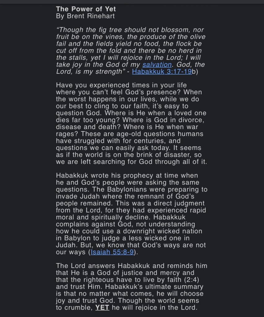 “Though the fig tree should not blossom, nor fruit be on the vines, the produce of the olive fail and the fields yield no food, the flock be cut off from the fold and there be no herd in the stalls, yet I will rejoice in the Lord; I will take joy in the God of my salvation. God, the Lord, is my strength” – Habakkuk 3:17-19b)